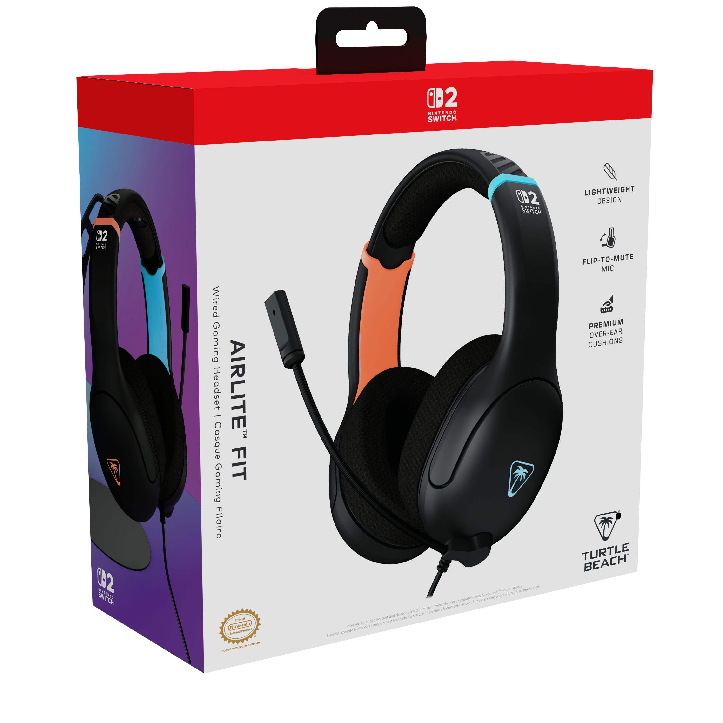 Enjoy a superior level of gaming and comfort with the new Turtle Beach Airlite Fit wired gaming headset for Nintendo Switch 2 and Nintendo Switch systems. Officially licensed and expertly designed in-house, this headset delivers finely tuned audio through high-quality 40mm speakers, providing an immersive experience for both casual and competitive gamers alike. The elevated over-ear jersey[MW1] [MM2] [BB3] knit cushions offer exceptional comfort, letting gamers hear every crisp high and deep low while effectively blocking out external noise. The sleek, noise-canceling microphone ensures voice chat is heard clearly and can be flipped up to mute it. The versatile 3.5mm audio connection is fully compatible across all Nintendo Switch systems.